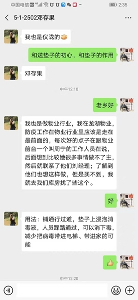 3栋业主肖代林为物管和需要的业主捐献了一次性雨衣。3栋1单元的业主李雪为邻居和物管捐了口罩。5栋1单元的业主邓存果了解到小区物业买不到专业的车垫和人行脚垫,就把自己的车垫、脚垫捐出来,铺在人、车通行过道,每天浸泡消毒液,给人、车消毒。