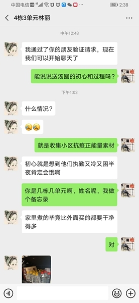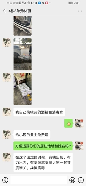 4栋3单元的业主林丽,看在小区值守的警察、社区工作人员、物业太冷太辛苦,就几次在家煮了热腾腾的汤圆送给他们当宵夜,她还把自己高价买的酒精和消毒水,大部分捐给需要的业主。有不少业主直接到卡点问值守人员是否需要人手,他们可以轮流来协助。