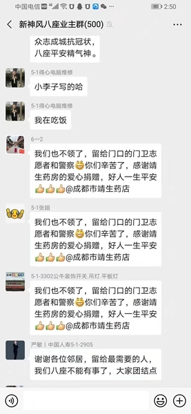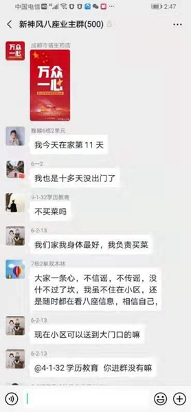 胥先生在新都某大型商场工作,过年回新繁老家父母处过年。听说小区被隔离后,业主群里的人都劝他不要回来住,胥先生就在群里问大家缺点啥,可以送进来,有业主就说缺新鲜菜,还有被封闭隔离那栋单元的业主在群里说想吃新鲜的豌豆尖,虽然社区统一配送菜,但不想为点小事给社区添麻烦。