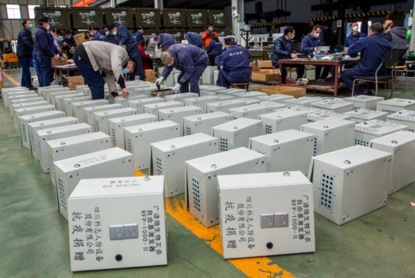 四川在线消息(记者 罗向明)2月16日下午,成都经开区车城东五路,四川科志人防设备股份有限公司生产车间内,两条线正同时快速运转:生产线上,几十名工人正紧急组装RFP-1000-Ⅱ型广谱微生物灭杀自由基激发器;搬运线上,工人正与中国邮政物流人员一道,将设备一台台装上物流运输车。