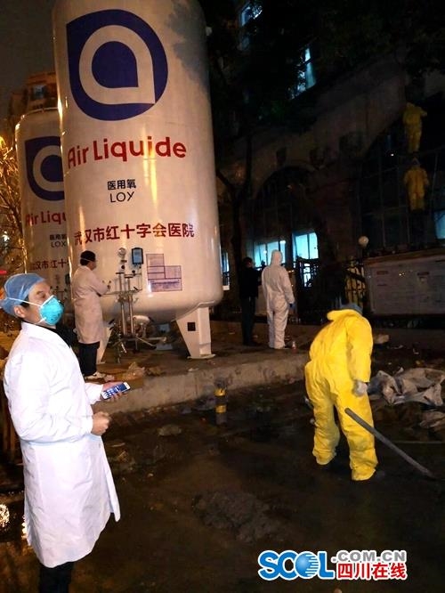 经过一支刚刚完成雷神山医院项目工程队9天时间的紧急改造,两个大型液态氧储气罐在武汉市红十字会医院安装完成。在不停氧的状态下,液态氧储气罐与医院原有供氧系统实现无缝对接,将新的氧气直接输送至各病区。制约四川医疗队临床救治多时的氧供难题,终于被破解。