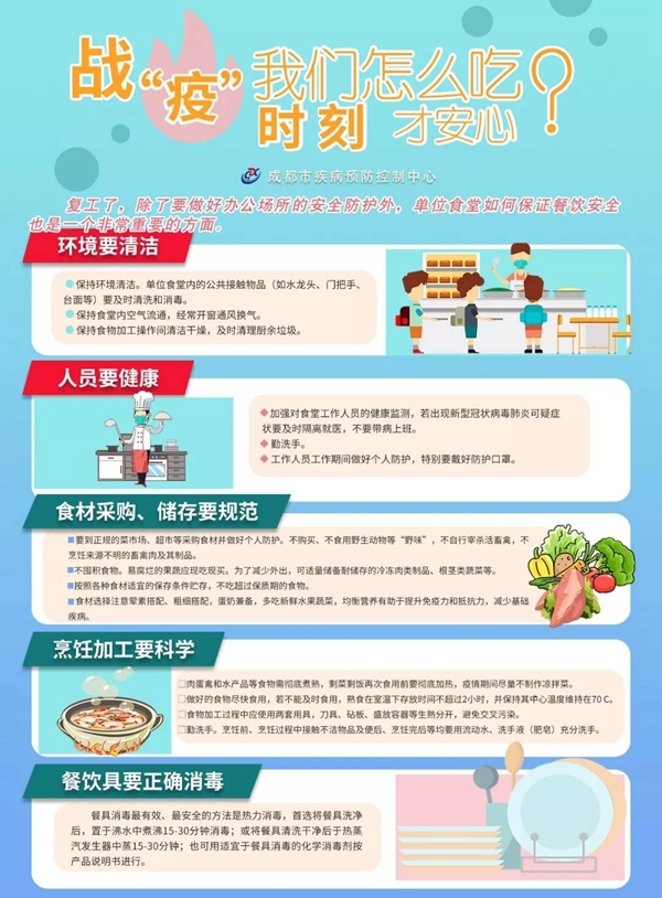那么,在新型冠状病毒肺炎疫情期间,我们大家在单位要怎么吃才安心?莫慌,成都疾病预防控制中心的专家来告诉你。近日,成都疾病预防控制中心发布了几条小贴士,告诉作为单位领导的你如何让员工在单位吃得安心。