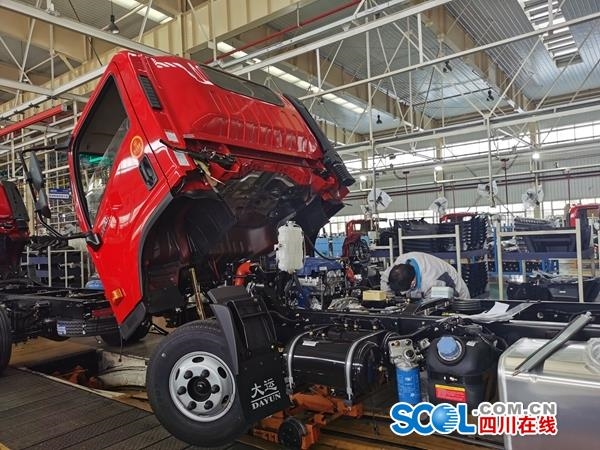 “经生产车间(线)智能化、数字化技术改造项目后,该卡车生产线已达到国际标准,在国内属于一流水平。”成都大运汽车集团有限公司常务副总经理谢平介绍说,总装线全长312米,以车架为主体进行整车合装,共有40多个工位,车子走完1个工位需要3.5分钟,这也是车间的生产节奏,平均每3.5分钟就有一台车总装下线,两小时总装完成一辆轻卡。