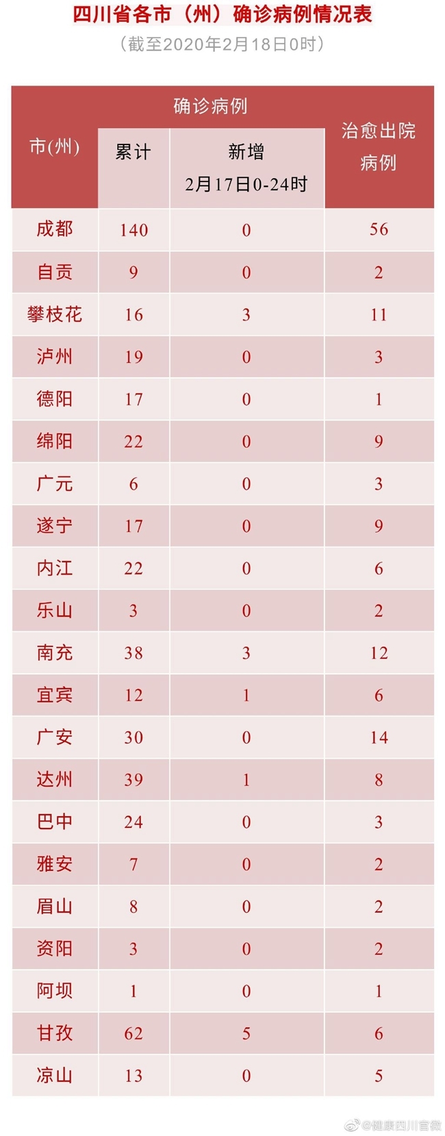 截至2月18日0时,四川省累计报告新型冠状病毒肺炎确诊病例508例,涉及21个市(州)。现有疫情县(市、区)101个(广安市前锋区曾报告疑似病例现已排除)。