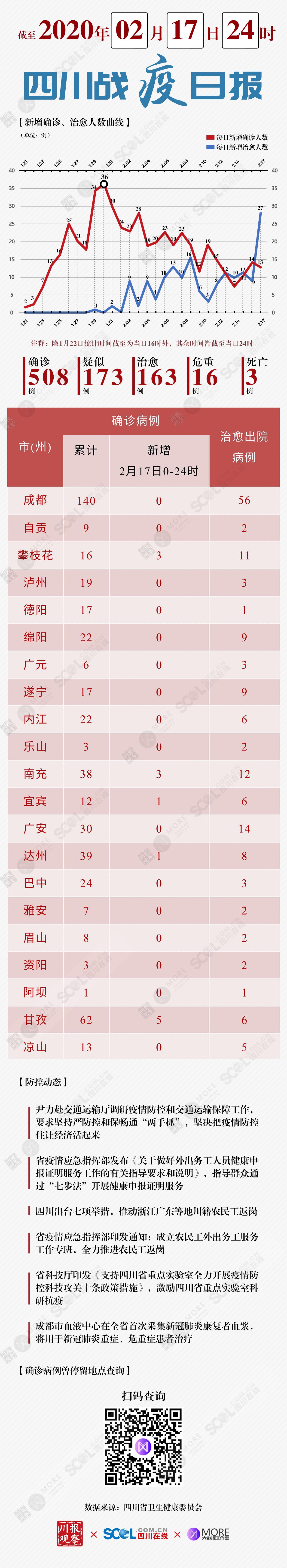 2月17日0-24时,四川省新型冠状病毒肺炎新增确诊病例13例,新增治愈出院病例27例,新增疑似病例31例,无新增死亡病例。