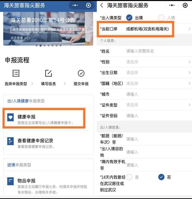 入境旅客应在航空公司工作人员组织下填写健康申明卡,或在微信小程序“海关旅客指尖服务”中填写健康申明卡,到达海关卫生检疫区域后,主动向关员出示纸质健康申明卡或电子健康申明条形码。