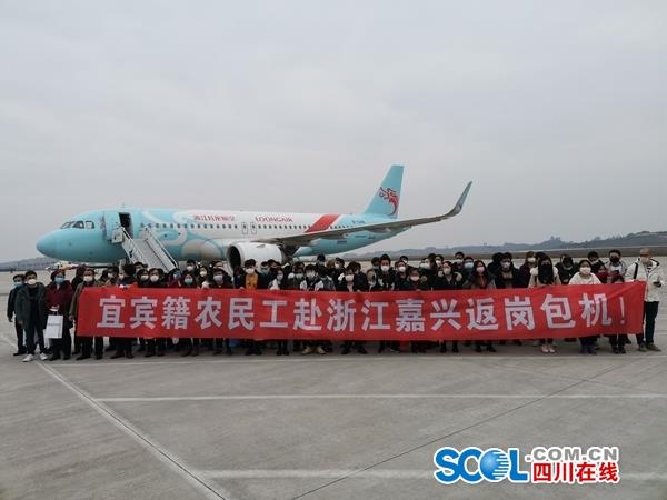 2月18日下午,一架从宜宾直达浙江的包机从宜宾五粮液机场起飞。来自宜宾全市的82名宜宾籍农民工免费乘坐包机赴浙江嘉兴返岗。