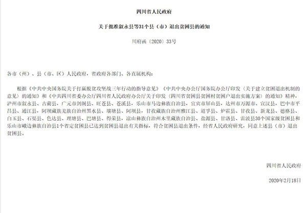 2月18日,四川省人民政府发布《关于批准叙永县等31个县(市)退出贫困县的通知》,批准四川省泸州市叙永县等30个国定贫困县,乐山市峨边县等1个省定贫困县退出贫困县序列。