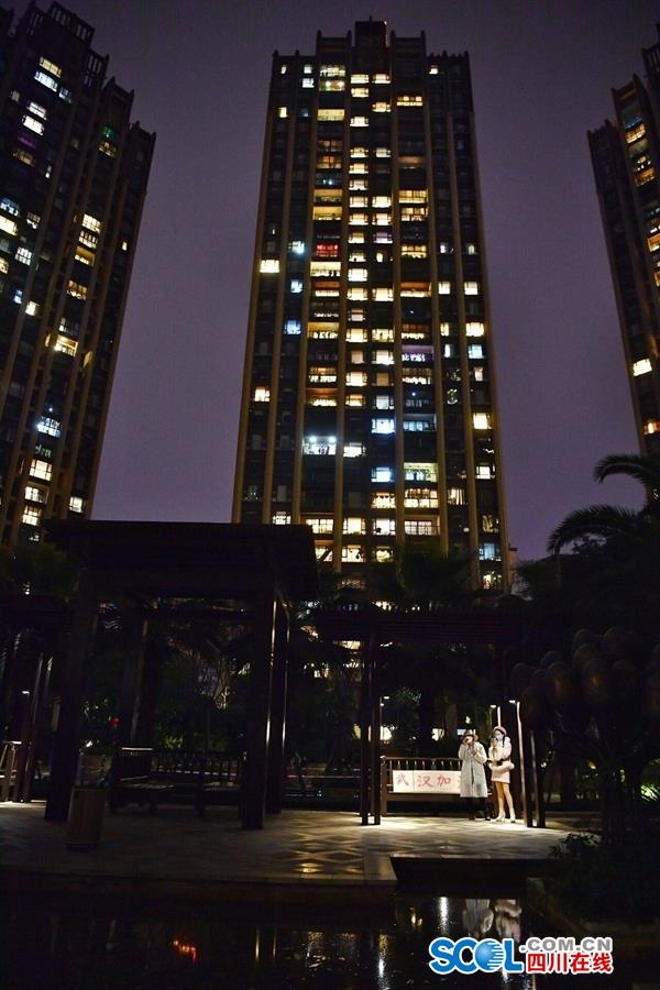 业主们提供了歌单,找来了配合音响。在《歌唱祖国》的歌声中开始大合唱,大家扯起喉咙,互相应援。当歌声落下的时刻,当“武汉加油”的声音在小区回荡,江城人民能否感受到蓉城人民的支持。