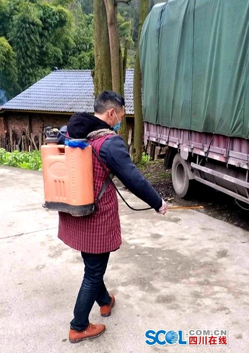 与冉拉史布一样,从江苏务工返乡的贫困户庞华书也留在家中等待复工的通知。“每天坐在家里没事情干,坐久了心里也烦”,2月10日,新场镇庞沟村村委会的工作人员为庞华书带来了一份“家门口”的工作,解决了他的烦恼。那天起,每日带上口罩、穿上雨鞋、背上消毒工具,挨家挨户为村民房前屋后喷洒消毒液成为了他的日常工作。