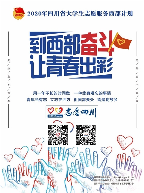 四川在线消息(记者 吴浩)2月18日,记者从共青团四川省委获悉,2020年四川省大学生志愿服务西部计划招募宣传工作即日起启动,省项目办今年拟在全省范围内征集西部计划招募宣传素材,并首次组建西部计划线上宣传工作队。