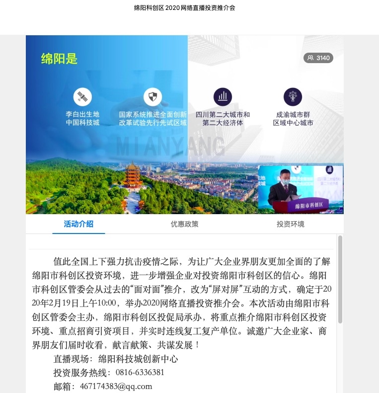 通过直播推介会,绵阳科创区重点推介了绵阳市科创区投资环境、重点招商引资项目。根据当天推介会的反馈,绵阳科创区还将通过网络手段,收集相关企业反馈。