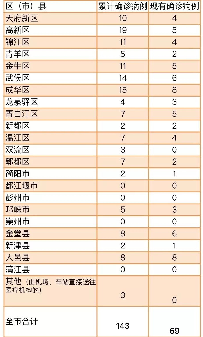 截至2月20日24时,成都市累计报告确诊病例143例,累计出院71人,死亡3人,其余69人(其中危重11人)均在定点医院隔离治疗,401名密切接触者正在接受医学观察。