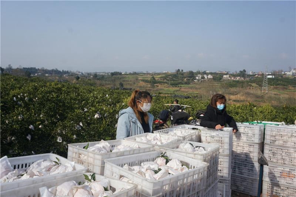 三溪镇万亩脐橙核心区域的金峰村,“留树保鲜”——红彤彤的脐橙、耙耙柑挂满枝头,处处飘荡着沁人心脾的柑橘香甜味。2月21日一早,几名村民戴着口罩,正分散开来忙于采摘果实。