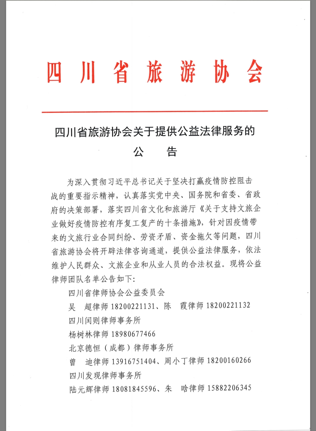 同时,省旅游协会公布了公益律师团队名单,由四川省律师协会公益委员会、四川闰则律师事务所等4家机构的8名律师组成,并公布每位律师的咨询服务联系方式,为游客、涉旅企业、从业人员等提供便捷的公益法律援助。