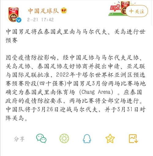 2月21日,中国足协在其官方微博发布公告,透露中国男足在即将到来的2022年世界杯亚洲区预选赛40强赛的两场比赛将放在泰国武里南举行,比赛时间分别为3月26日与马尔代夫以及3月31日对阵关岛。