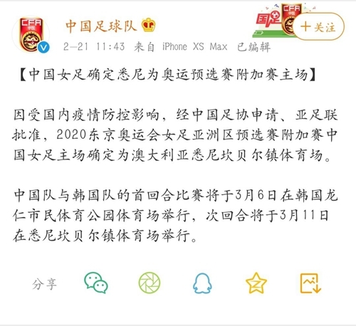 与此同时,中国足协此前也确定了中国女足与韩国女足的2020年东京奥运会女足亚洲区预选赛淘汰赛的主场——澳大利亚悉尼,而这一决定也已经得到了亚足联的认可。