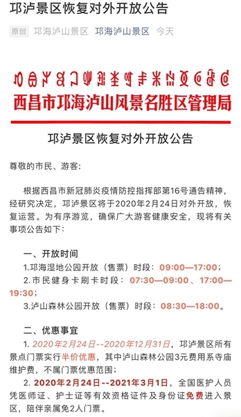 四川在线消息(记者 杨艺茂)2月21日,记者从西昌市邛海泸山风景名胜区管理局获悉,根据西昌市新冠肺炎疫情防控指挥部第16号通告精神,经研究决定,邛泸景区将于2020年2月24日对外开放,恢复运营。