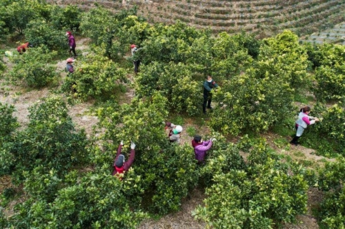 走在天宫镇四通八达的水泥村道上,目之所及都是长势旺盛的柑橘。一些果园里,套袋的果汁沉甸甸缀满了枝头。“农业+旅游”铺陈的画卷,生机勃勃。