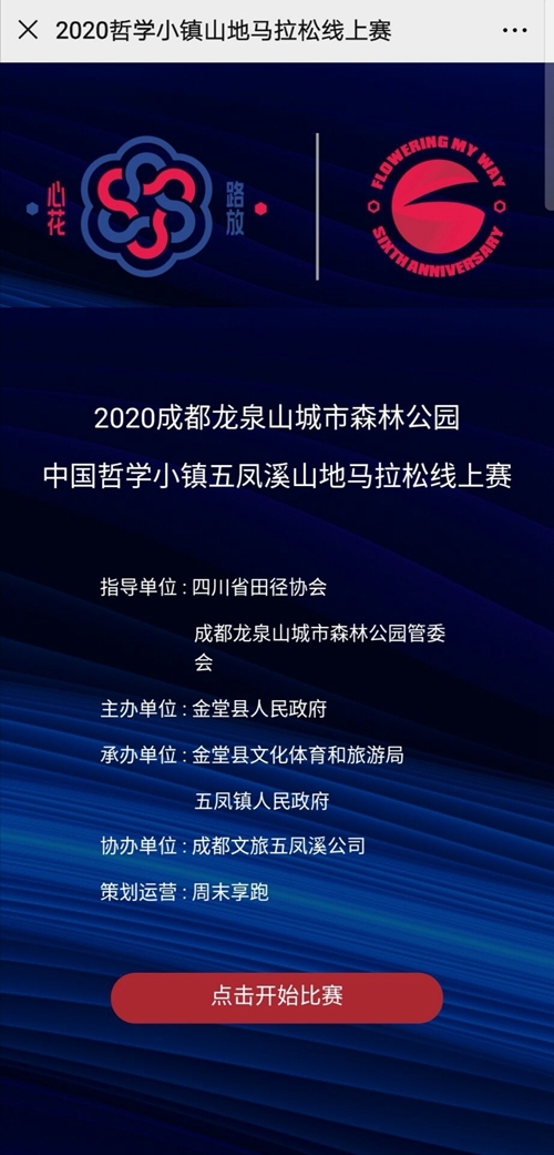 为了响应国家号召同时也是为了确保参赛选手以及工作人员的身体健康,本应该在2月23日举行的“2020成都龙泉山城市森林公园·中国哲学小镇五凤溪山地马拉松”(以下简称2020哲马)延期至5月份。虽然线下的比赛延后,但是为了让参赛选手的期待不落空,2020哲马线上赛应运而生。2020哲马线上赛由四川省田径协会、成都龙泉山城市森林公园管委会指导,金堂县人民政府主办,金堂县文化体育和旅游局、五凤镇人民政府承办,成都文旅五凤溪公司协办。