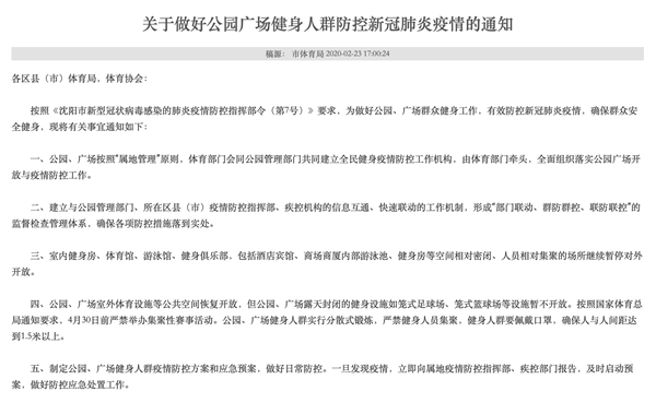 目前,沈阳市体育局已经将《关于做好公园广场健身人群防控新冠肺炎疫情的通知》删除。