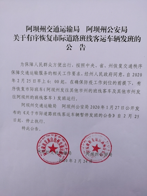 2月24日,阿坝州交通运输局、阿坝州公安局联合发布《关于有序恢复市际道路班线客运车辆发班的公告》,为保障人民群众方便出行,经州人民政府同意,自2020年2月25日早上6:00起,在确保防疫工作到位的前提下,有序恢复市际班车(阿坝州发往其他市州的班线客车及其他市州发往阿坝州的班线客车)发班运行。