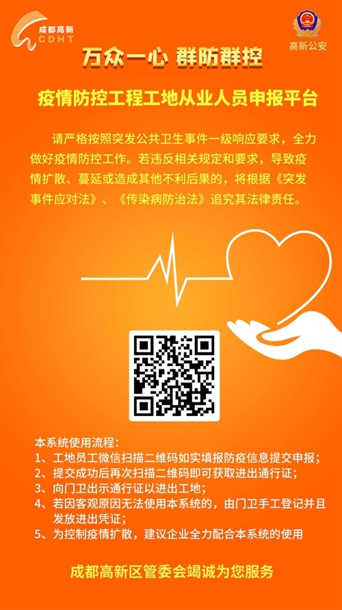 记者看到,在成都高新东区项目工地门口,都张贴了一张“疫情防控工程工地从业人员申报平台”二维码填报单。据了解,这是成都高新区在疫情防控信息平台的4个子平台基础上,专门为工地员工打造的信息化申报平台。