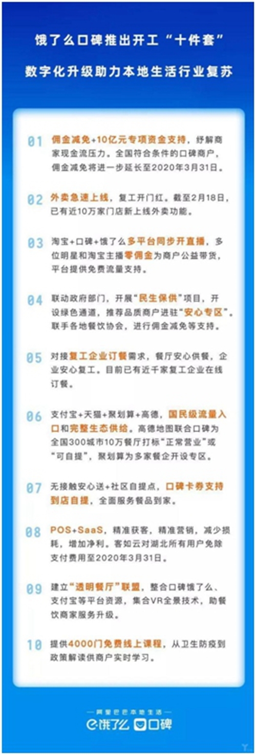 ——饿了么口碑:佣金减免、免费带货、对接企业复工订餐