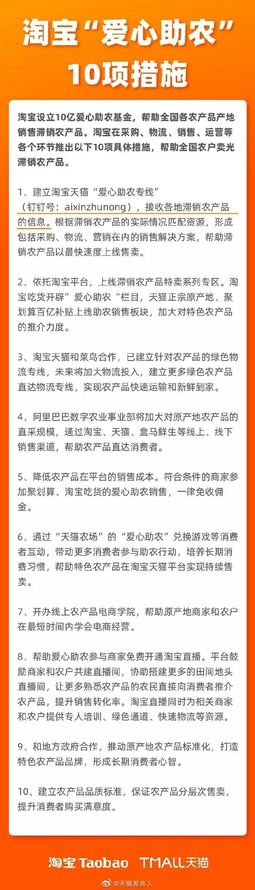 ——淘宝助农:上线滞销农产品特卖专区,开办农产品电商学院,免费开通淘宝直播
