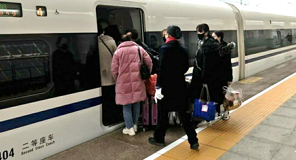 当天,来自内江各县(市、区)的外出务工人员来到成渝高铁内江北站,领取了统一乘车标识后,他们依次前往进站口测量体温、核实身份信息,并按照车厢号排列依次从检票口通过,到达指定位置候车。