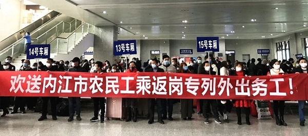 为了顺利开行本批次返岗复工专列,内江市人社部门积极与驻外农劳工作站对接,摸清外地企业用工需求,积极协调交通运输铁路部门开通返岗专列,并为内江市外出务工人员提供免费健康服务,确保外出务工人员顺利返岗复工。