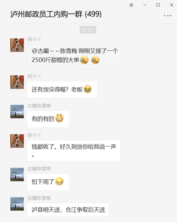 四川在线消息(赵维丽 记者 魏冯)“客户收到甜橙,特意电话回复:果子个头还不小,甜,水份足,好评!”“我的甜橙收到,好评!谢谢”“这个客户说好吃,还要买......”2月24日,记者从泸州邮政分公司获悉,泸州邮政员工内购群内,大家都在反馈购买的爱心甜橙果品情况。