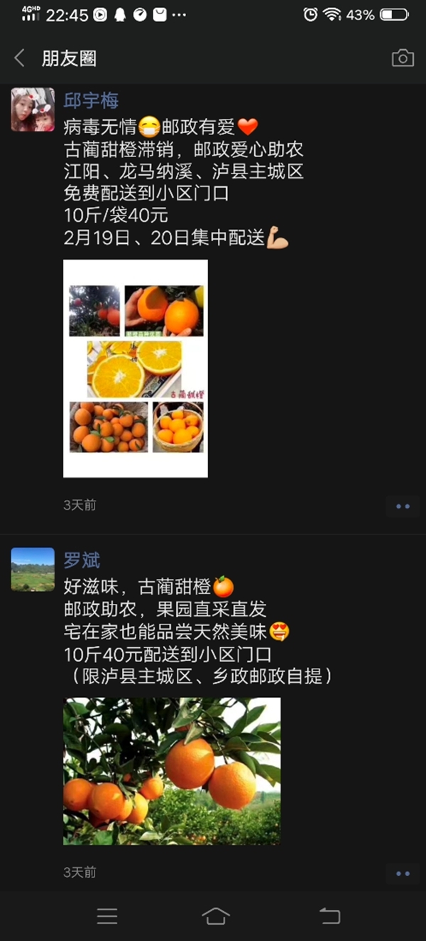 “我们想办法,共渡难关!”泸州邮政分公司分管副总经理第一个站出来作出服务承诺。2月15日,渠道平台部胡艳经理立即行动,将第一个助农项目锁定为古蔺甜橙,联系古蔺公司实地考察、组织货源、严格品控,同时通过各种工作群、员工内购群发出倡议。