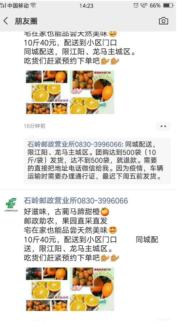 一石激起千层浪。一条“病毒无情,邮政有爱,古蔺甜橙滞销,邮政爱心助农”的微信被不少员工转发到朋友圈,又被一些爱心人士转发,订单纷沓而至。第一个订单来自微信名为“七喜可乐”的市民,委托古蔺邮政为县疾控中心送去50斤甜橙。