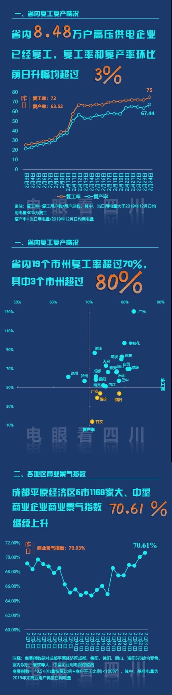 “你看,24日复工率不错,达到75%,环比上日增长3%。”国网四川省电力公司信息通信公司(大数据中心)调控中心主任吕磊指着横屏上的曲线说,24日复产率也达到67.44%,环比上日增长3.92%,呈现较好增长的态势。具体到单日数据看,24日复工的企业数量达到8.48万户,与23日8.15万户相比,增加3000多户。