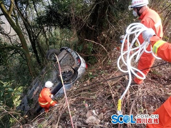 上午10:22分许,彭州市通济专职消防队接到报警电话后,立即出动两台消防车13名队员立即赶赴现场。到场后,救援人员发现,一辆白色的宝骏SUV轿车车头朝下四脚朝天躺在距离路边约3米高的半山腰,轿车恰好被一棵树子挡着,下面是10米高的悬崖。经现场询问初步得知,车上一共有四人,其中有一名儿童,均无生命危险。