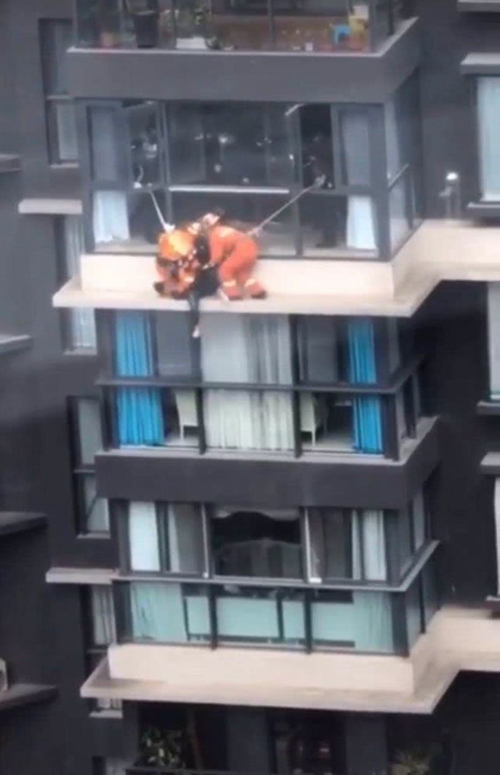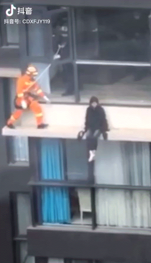 接到报警后,消防员迅速赶赴现场进行处置,消防员到现场后发现,一名女子在17楼窗户外沿边坐着,稍有不慎就有坠楼的可能。