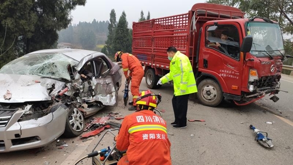 四川在线消息(雷萧 王新宇 记者 陈松)2月25日09时19分许,319国道乐至县龙溪乡花祠堂村路段发生车祸,导致轿车内2人被困。乐至消防接到报警后迅速赶到现场将2人救出。