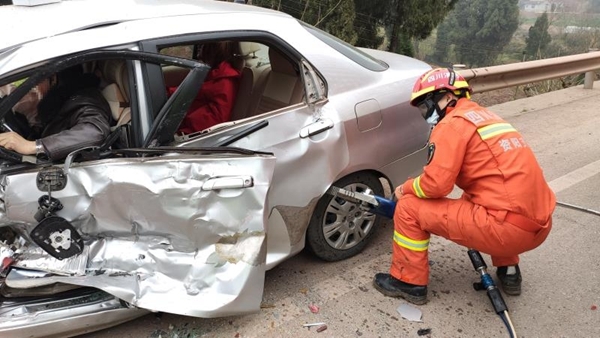 事发时,一辆货车和一辆轿车发生碰撞,轿车驾驶室被撞严重变形,导致驾驶员和后排一乘客被卡车内且不同程度受伤。针对车内人员被困情况,消防指战员迅速利用破拆工具扩大轿车内部救援空间,先后成功将2名被困人员救出。
