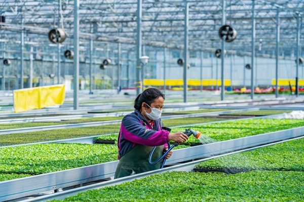 与此同时,上游企业惠美花境的生产资料也陆续到货。2月25日,记者在公司的基地看到,物流车拉着育苗盘进入工厂,工人开始有序卸货。“我们也不会减少生产计划。”曾萍说,工人到岗率已经超过95%,目前正在进行田间管护和育苗工作。