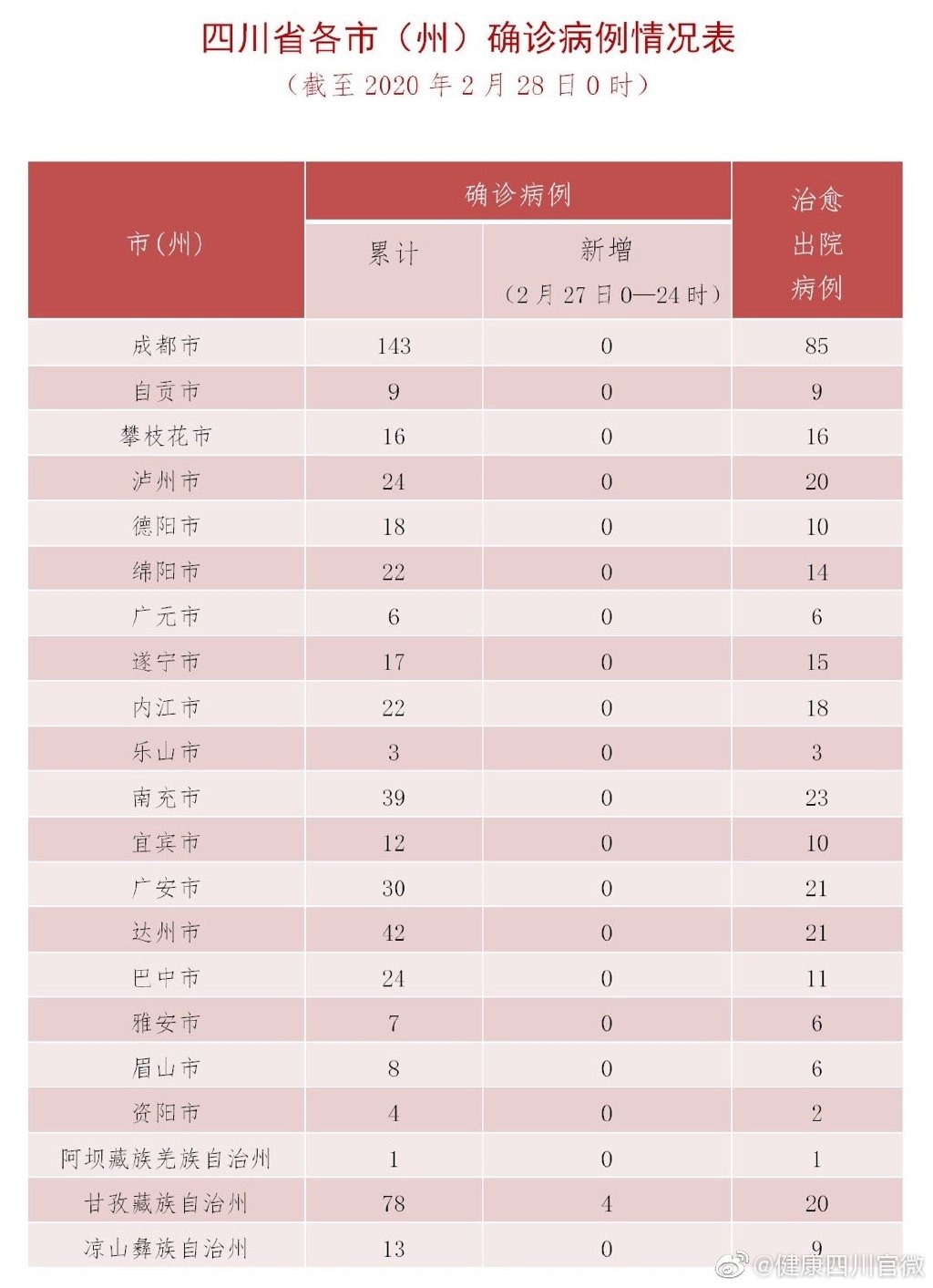 截至2月28日0时,四川省累计报告新型冠状病毒肺炎确诊病例538例,涉及21个市(州)。