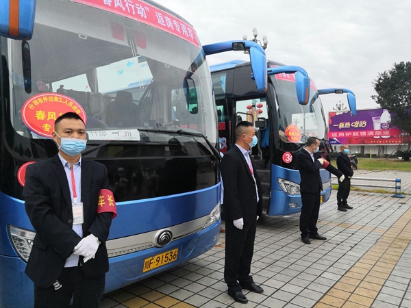 “春风行动”实现了精准“点对点”护送。“你好!我是一名外出务工人员,请问至广州的班车什么时间开通……”在看到什邡市交通局集中发布在电视、微信等渠道的道路运力保障和交通信息后,在广州芳村建筑有限公司务工人员代表王玉光主动打通了联系电话。什邡市交通局在了解到什邡在该公司务工人员多达52名,分散前往会增加感染风险的情况后,决定开通直达专车护送52人,安排市交通运输集团落实专人与该企业取得联系,对运行路线等情况进行确认,最终确定了“家门对厂门”式的封闭运行方式。