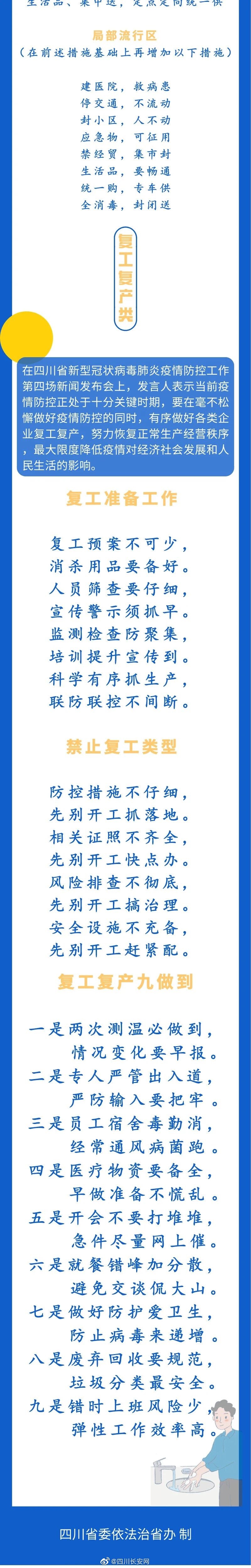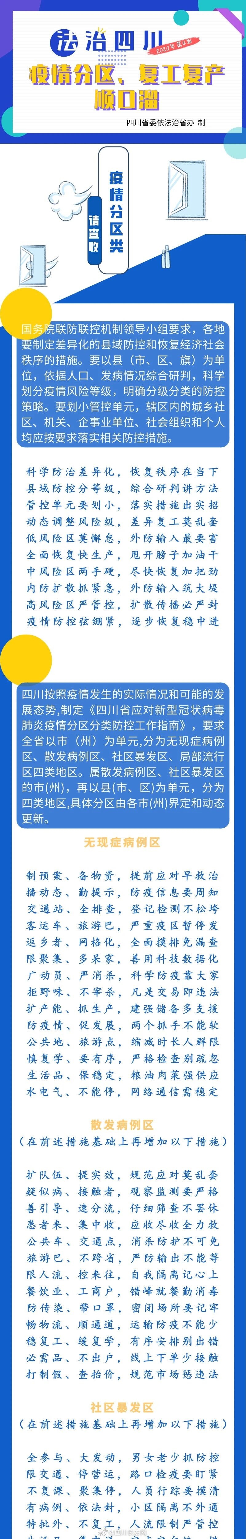四川在线消息(记者 黄大海)2月28日,省卫健委首次公布全省183个县(市、区)疫情分区分级情况。四川省疾控中心主任医师、省卫生健康委应对新冠肺炎疫情领导小组疾病防控专家组组长祝小平介绍,不同的分区应采取不同的防控措施,低风险区要尽快推动企业全面复工复产,中风险区要合理安排复工复产,那么,不同的风险区具体应该注意哪些问题,如何组织复工复产?省委依法治省办专门制作了关于疫情分区、复工复产的顺口溜,帮助记忆相关信息。