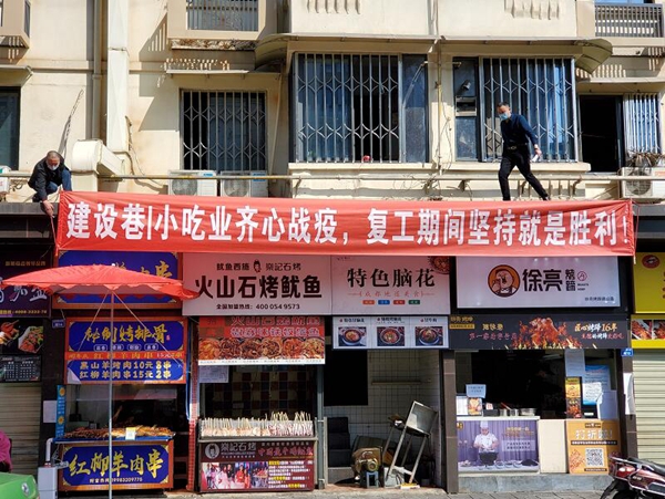 “开门生意不好,关门损失很大。这个关键时期,信心很重要,坚持更重要!”90后的胡家晨已经是拥有十来年经验的资深小吃从业者,组织建设巷第一批复工商家代表参加是本次“店宣活动”,100条特殊的店宣横幅就是他的手笔。