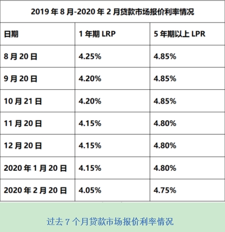 从人行公布的LPR来看,过去半年时间里1年期LRP和5年期以上LPR均呈现下降趋势。 2020年2月20日,央行公布的LPR为:1年期4.05%,5年期以上4.75%。