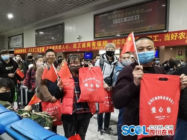 当天早上,35辆大巴前往各村接农民工,然后在麻柳场镇集中,分发火车票。现场还给每人发放了爱心包,里面有矿泉水、方便面、口罩、硫磺皂、纸巾、湿纸巾等物品。