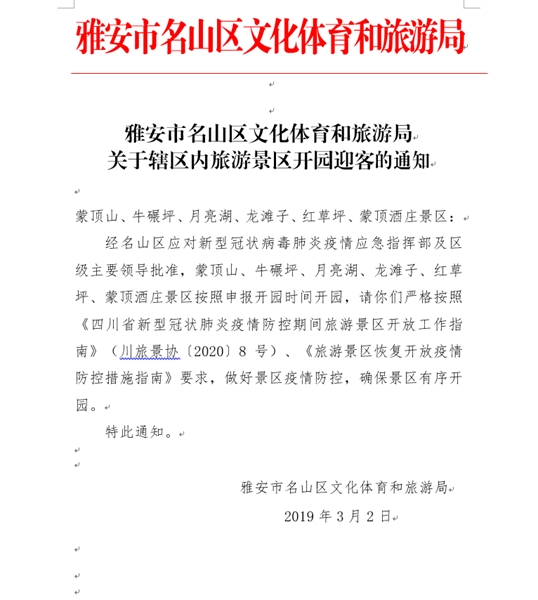 四川在线消息(记者 文莎)3月3日,四川省名山蒙顶山旅游开发有限责任公司发布公告,称根据当前新型冠肺炎疫情防控形势,蒙顶山旅游景区将于2020年3月4日起正式对外有序开放,暂定景区日接待量不超过1000人。