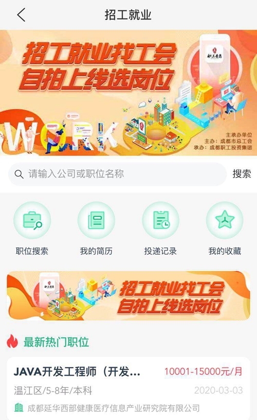 为了积极响应中央关于复工复产的号召,落实春风行动,成都市总工会依托成都职工APP上线了招工就业的服务平台,充分利用好工会的资源,发挥好工会的职能,把为企业、职工服务落到实处。利用大数据等互联网技术,精准对接用工和求职的需求,为企业的复工保驾护航。