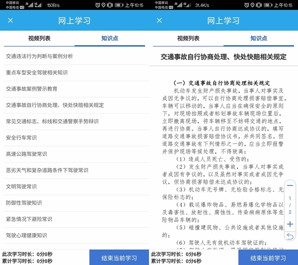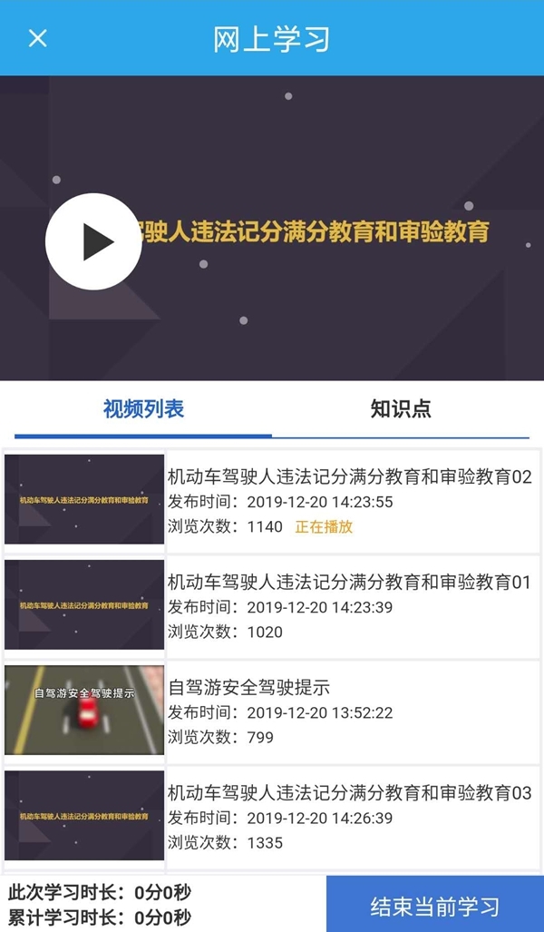 8、点击知识点,查看当前视频知识点,在查看当前页面时,开始计时。每次连续学习五分钟以上的计入累计学习时间,三日内累计学习满三十分钟为一次,学习时间达标后七个工作日内可以申请参加道路交通安全法律、法规和相关知识网上考试,考试未通过的可以在二十四小时内补考,补考以二次为限。