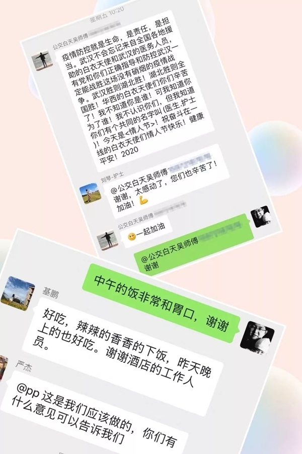 “武汉已经封城三十余天了,但这座城市依然在正常的运转。每天我们接触到很多的武汉人,驻地的联络员,公交车师傅,酒店的保安,打扫卫生的阿姨等等,从他们身上,都能看到武汉人的坚韧和不屈。”虽然在武汉的时间很短,但生活中的很多细节却已让徐原宁终身难忘。例如,情人节当天,公交吴师傅的祝福;每天回到酒店后帮我们测量体温的保安大哥,量完后总会说一句“你辛苦了”;二楼餐厅发餐的小姑娘总会说“我们应该的”等等。
